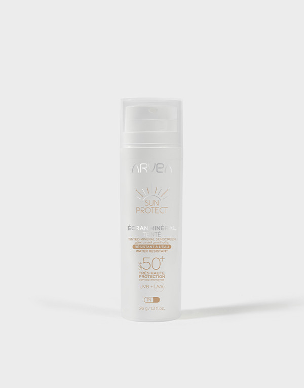 L’écran minéral teinté SPF 50+ de la gamme SUN PROTECT procure une très haute protection solaire contre les UVB et les UVA. Conçu pour tous types de peaux, ses filtres 100 % minéraux garantissent un maximum de tolérance. De texture crème légère facile à étaler et à la formule teintée et résistante à l’eau, il apporte une couvrance modulable de légère à moyenne pour un effet bonne mine.